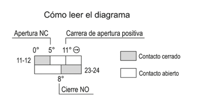 En la figura también podemos apreciar el diagrama de contactos el cual nos permite saber en que punto de ángulo de giro de la bisagra se conmutan los contactos, tanto los abiertos como los cerrados, y como podemos observar, hay un momento de incertidumbre en el que los contacos NC se quedan abiertos y los NO no se terminan de cerrar (entre 5º y 8º de inclinación del mecanismo de la bisagra.)