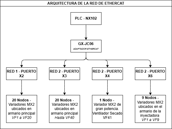 - Para este proyecto se montado un adaptador especial para Ethercat el cual divide la red de Ethercat en sub redes, esto nos permite tener un mejor control sobre la aplicación en caso de un fallo de comunicación en el equipo, ya que solo dejaría de funcionar una parte de la red de Ethercat y no todo el equipo.