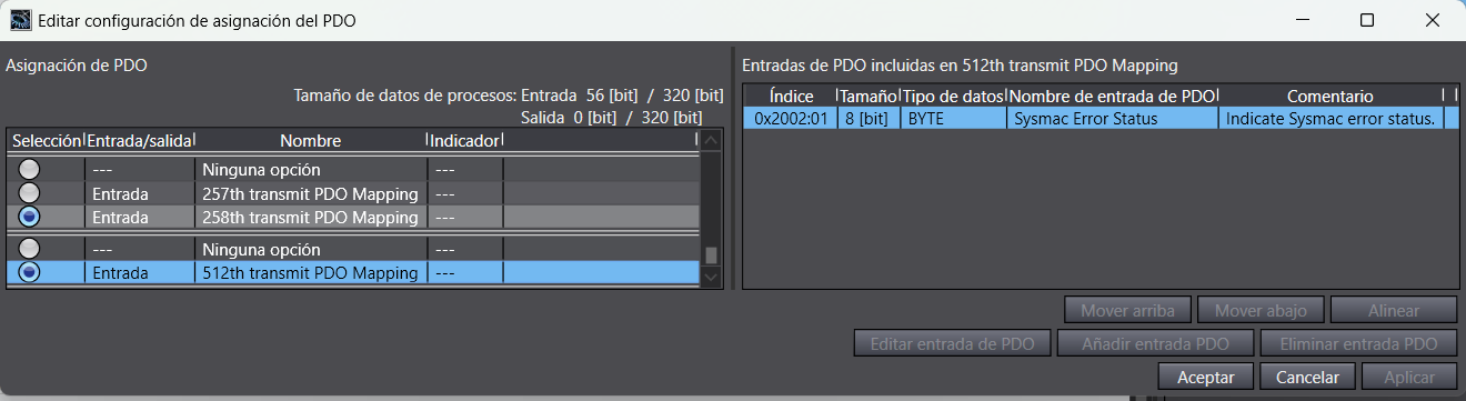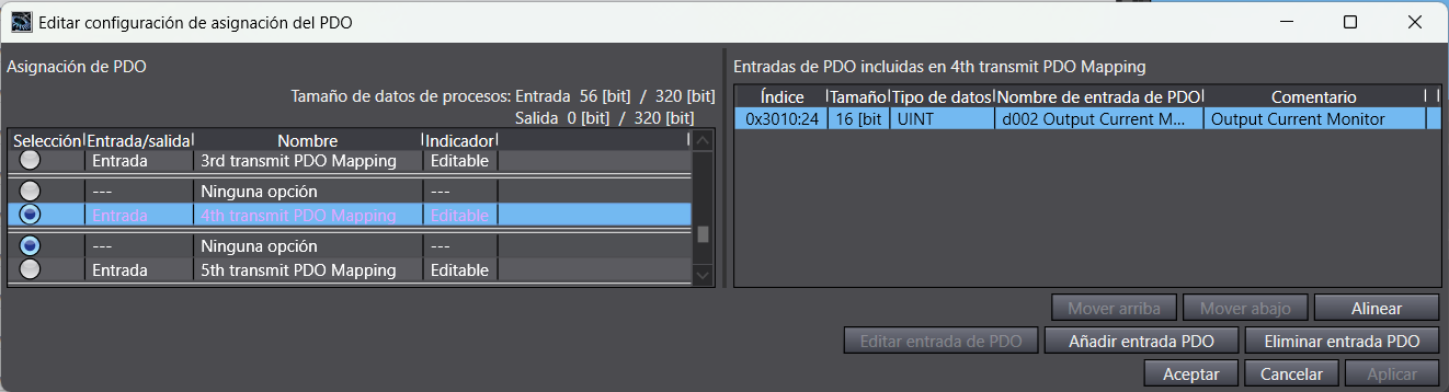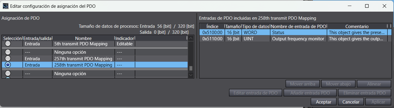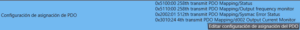 Para la comunicación de la velocidad se ha optado por un ciclo de SDO, lo cual implica una activación por programa de la comunicación. Se ha optado por este método ya que el control del RUN de estos variadores no funciona a través de Ethercat, sino por entradas digitales. De este modo evitamos problemas si se da un fallo de comunicación ya que podría dejar parada la línea si la comunicación se realizase por PDO. Por lo tanto, los canales del PDO que se utilizan son los siguientes para cada uno de los variadores: