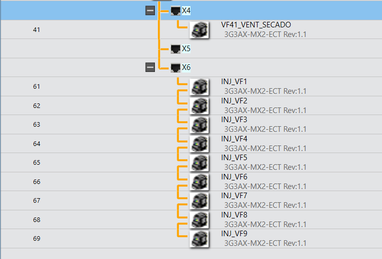 En este proyecto en concreto son 53 variadores en un armario principal, 7 variadores en un armario secundario que controla unas cintas transportadoras de una máquina de inyectado relleno y otros 4 variadores otro armario secundario que controlan las cintas aéreas de donette.