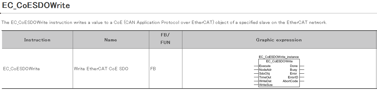Para realizar la comunicación por SDO se utiliza una función de Sysmac studio llamada EC_CoESDOWrite.