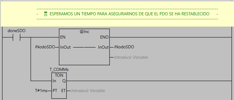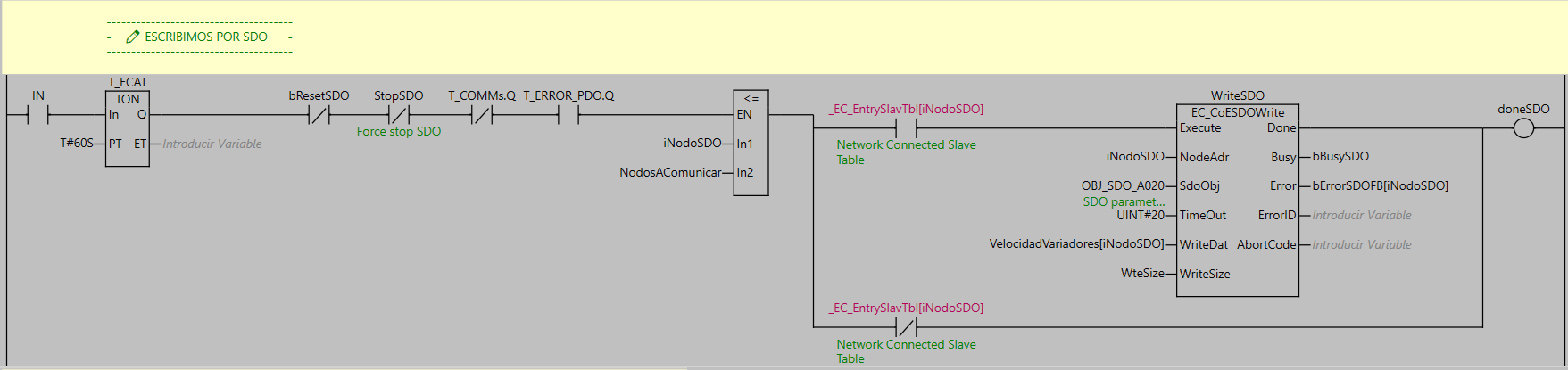 En este caso se comunican 52 Variadores, una vez que se ha completado la instrucción, doneSDO, se incrementa el numero del índice a comunicar el cual se utiliza tanto para el NodeAdr como el array de velocidad a comunicar.
