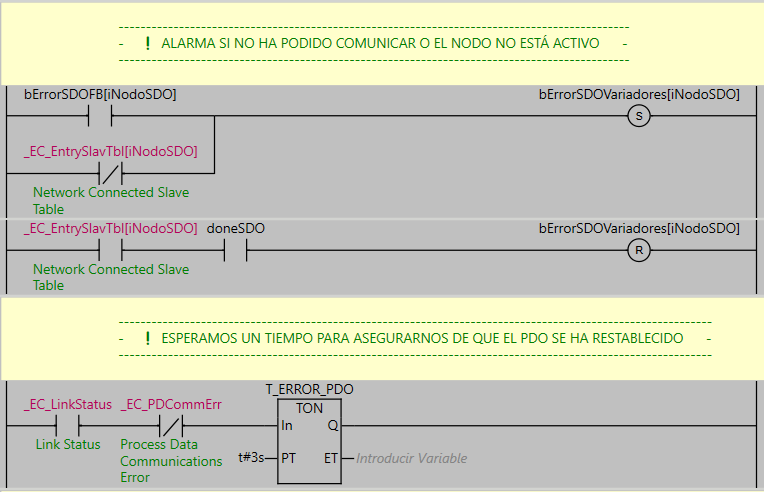 En este apartado se gestionan alarmas para que el usuario sepa que variadores no están comunicando y cuales si, además nos indicará si ha tenido un fallo en la ejecución de la FB.