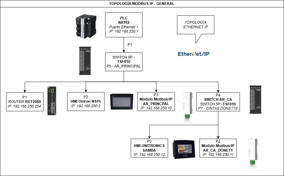En este esquema podemos apreciar la conexión de cada uno de los elementos por Ethernet IP así como sus IP configuradas. por el momento nos vamos a centrar en la configuración y ajuste de los módulos conversores de Ethernet/IP a Modbus RTU.