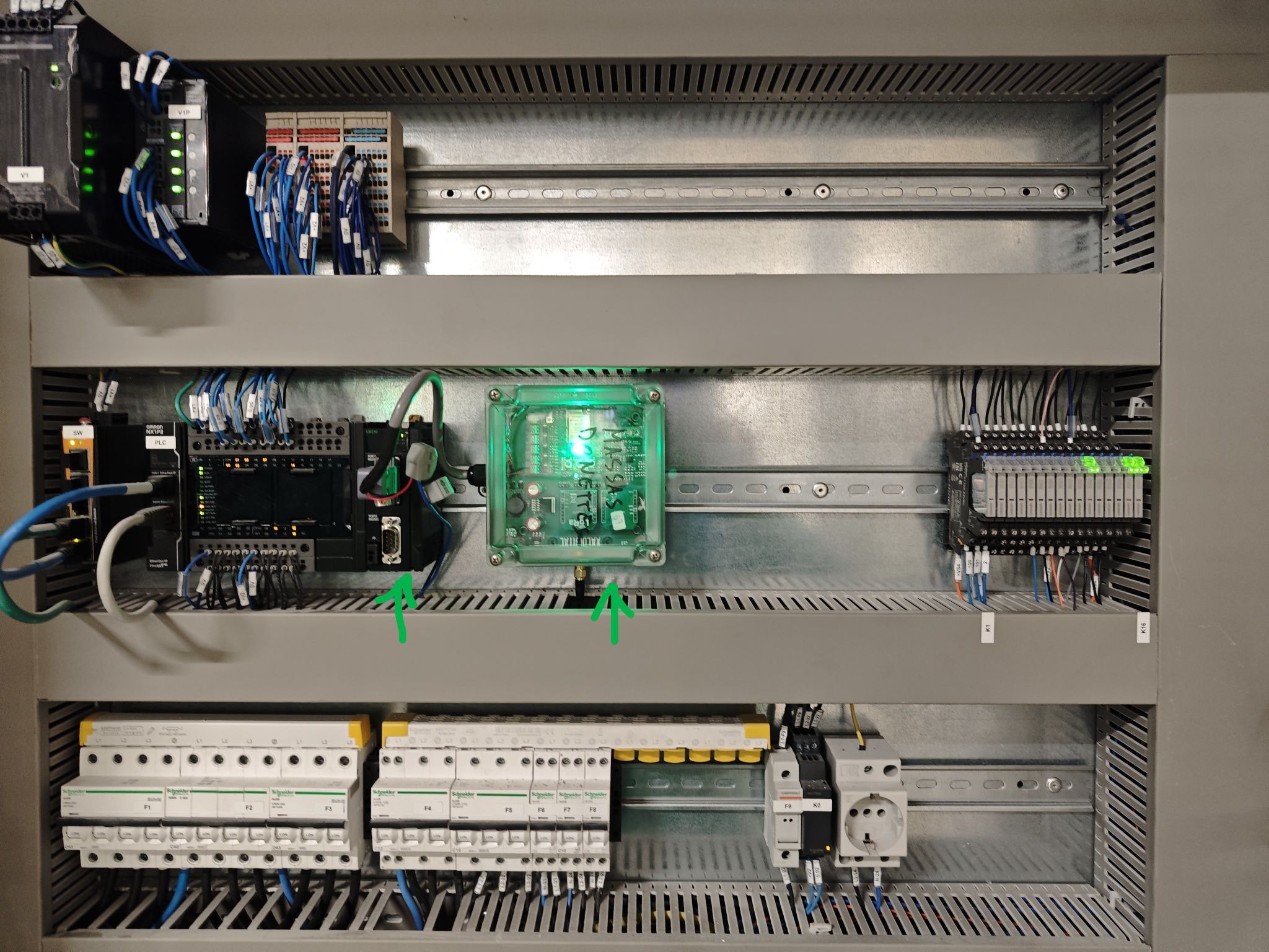 Montaje de módulo RS232 para la comunicación con el sistema de recogida de datos de producción de la planta, se instala en el armario de la amasadora de donette. Esto permite contabilizar el número de masas que se han producido y que están previstas en esa producción se envía una trama RS232 cada vez que se finaliza un amasado.