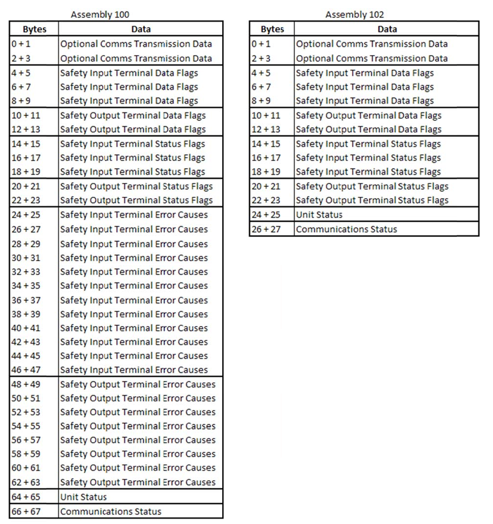 En este apartado, hay dos "Assembly" el 100 y el 102, nosotros utilizaremos el 100 ya que es el que más información nos aporta acerca del estado del módulo de seguridad así como de sus entradas y salidas. Un assembly no es más que un tipo de datos que nos entrega el módulo, nosotros decidiremos cual queremos leer desde la configuración de Ethernet IP de Sysmac studio con el autómata.