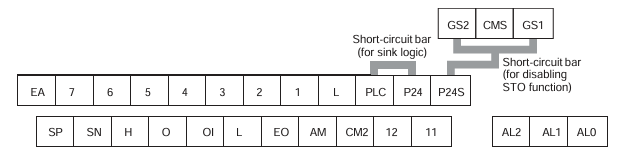 PLC | Input terminal power supply | Sink logic: short to P24 / Source logic: short to L. | External supply via removed bar. | |